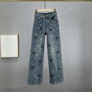 Women’s Fleece Jeans New Winter Denim Jeans Loose Embroidered Hot Rhinestone Fashion High Waist Wide-Leg Trousers